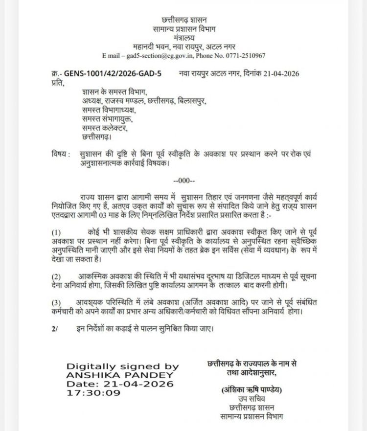 तीन माह के लिए हर तरह की छुट्टी पर रोक  : छत्तीसगढ़ में बड़ा प्रशासनिक एक्शन