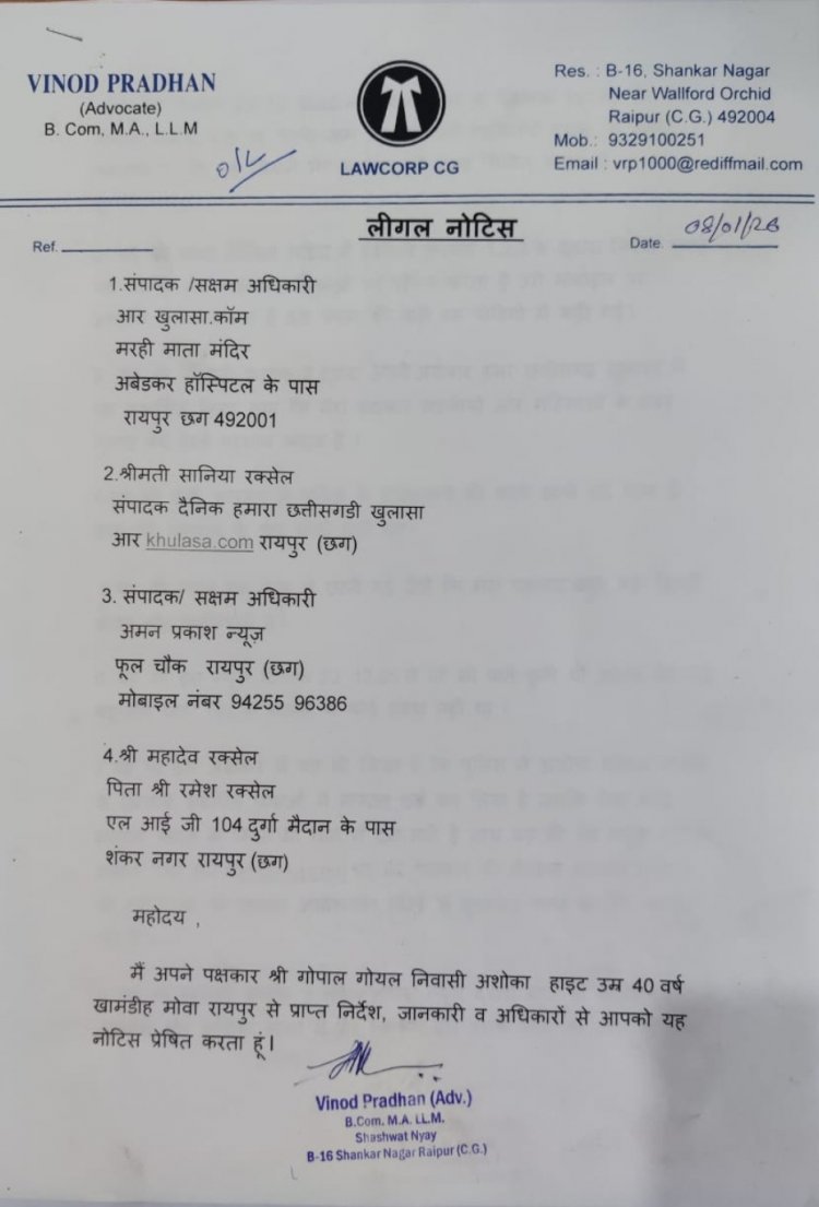 रायपुर निवासी व्यक्ति की छवि को जानबूझकर धूमिल करने, सामाजिक प्रतिष्ठा को ठेस पहुँचाने तथा उन्हें मानसिक, सामाजिक व आर्थिक रूप से क्षति पहुँचाने के उद्देश्य से कुछ मीडिया संस्थानों एवं व्यक्तियों द्वारा गंभीर आपराधिक कृत्य किए जाने का मामला सामने आया है। इस संबंध में संबंधित व्यक्ति की ओर से अधिवक्ता विनोद प्रधान (LAWCorp CG) के माध्यम से संबंधित मीडिया संस्थानों व व्यक्तियों को कड़ा कानूनी नोटिस जारी किया गया है |